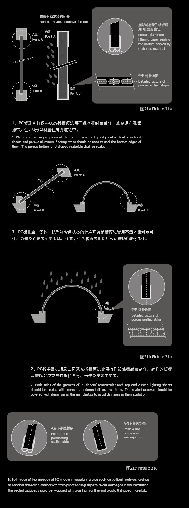 C. 使用鋁箔膠帶和專用透氣膠帶對板材孔格端部進行封口處理,這兩種膠帶可以從有實力的膠帶生產商處獲得或者通過華獅龍經銷商獲得。(見圖 21a, 21b, 21c) 對于替代材料,請參閱我們的"與碳酸聚酯板相容的粘合劑與密封劑"技術信息手冊,或者咨詢你的華獅龍經銷商。